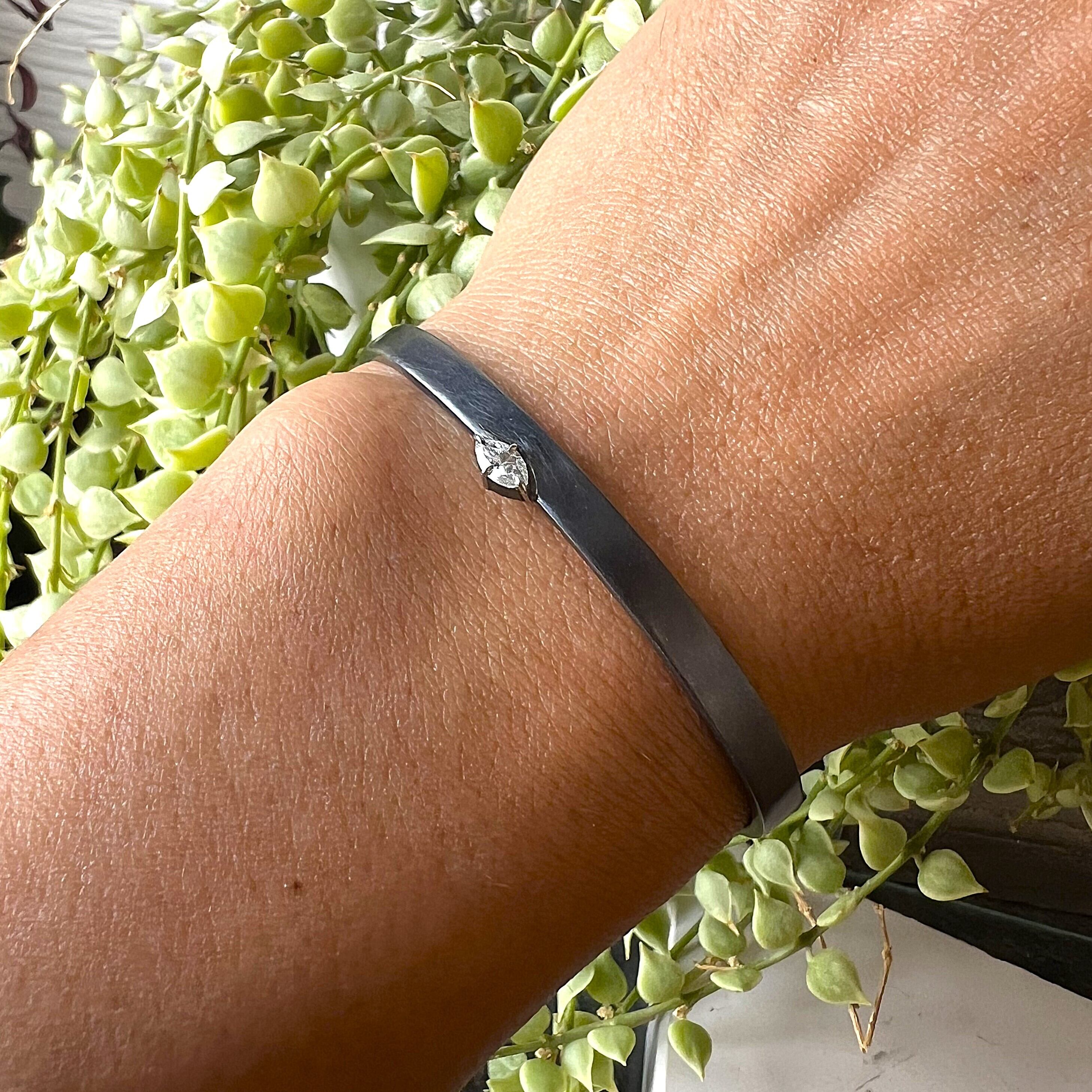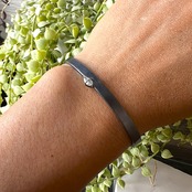 一見シンプルですがエンド部分にはゴールドパーツとダイヤモンドを配し、時計などともコーディネートしやすいようにデザインしています。