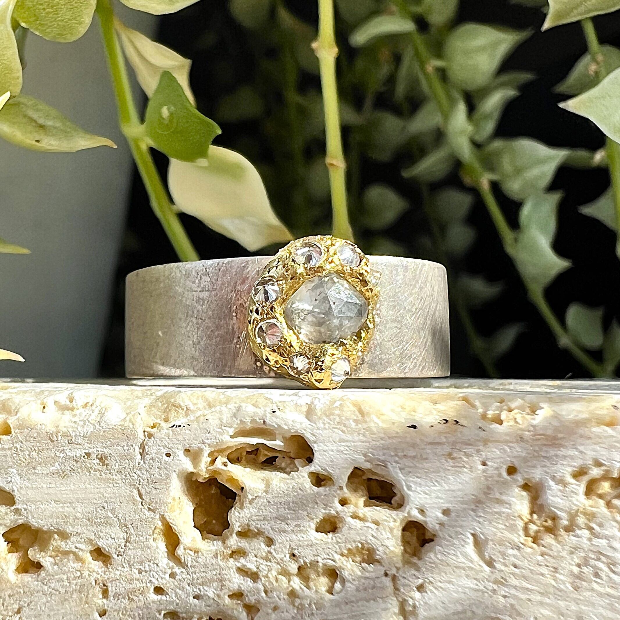 溶けた金属に直接宝石をセットする特殊な制作方法をとっており、
