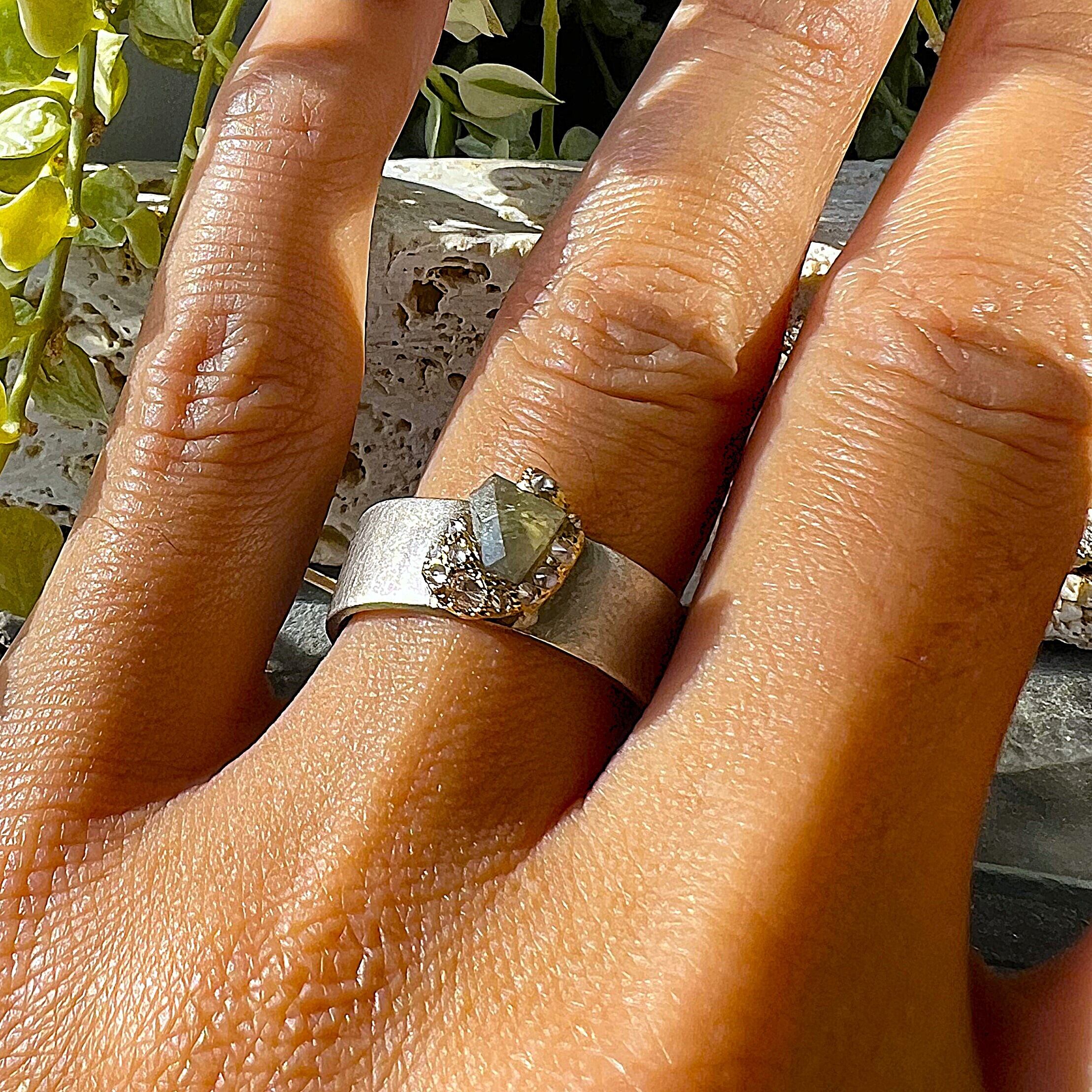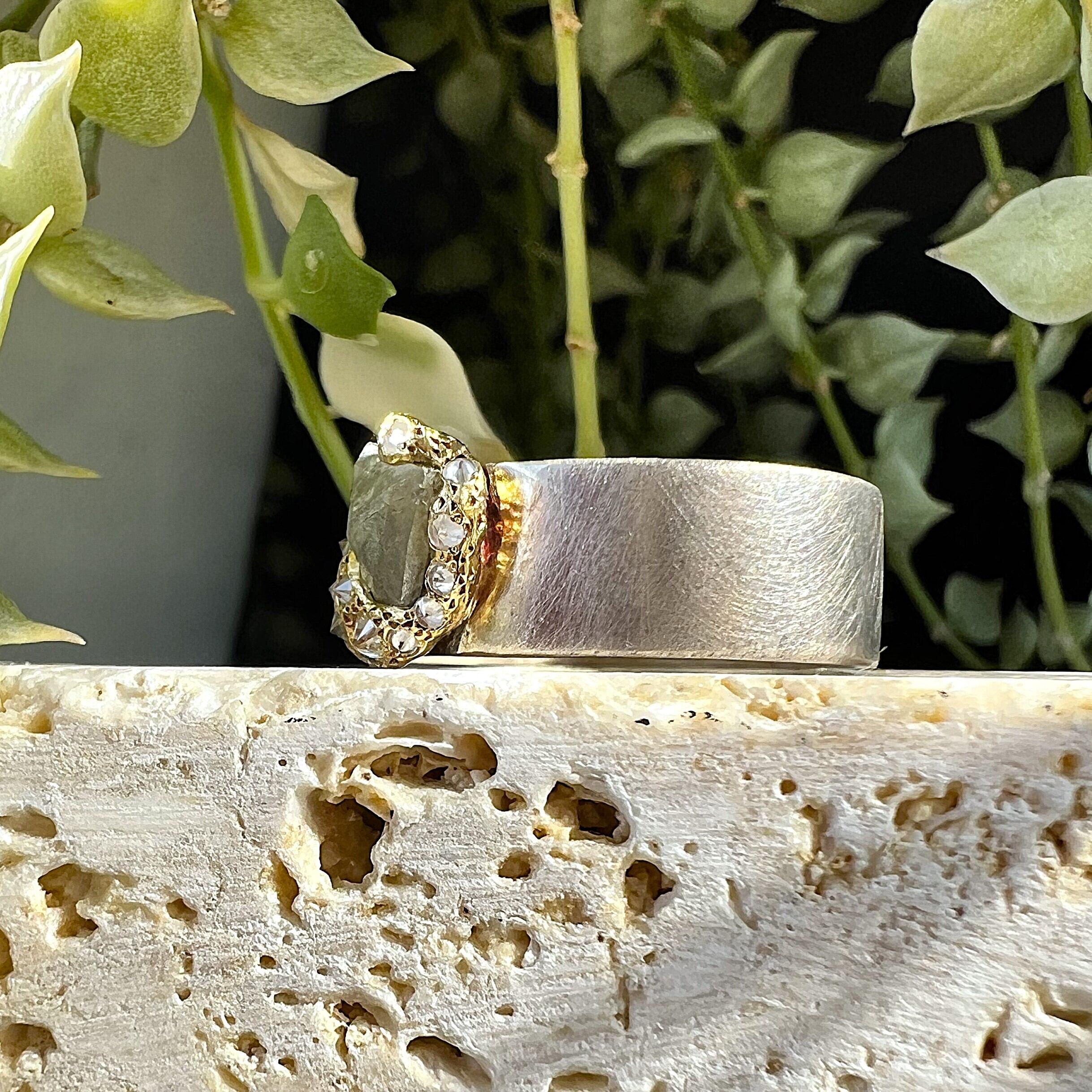 溶けた金属に直接宝石をセットする特殊な制作方法をとっており、