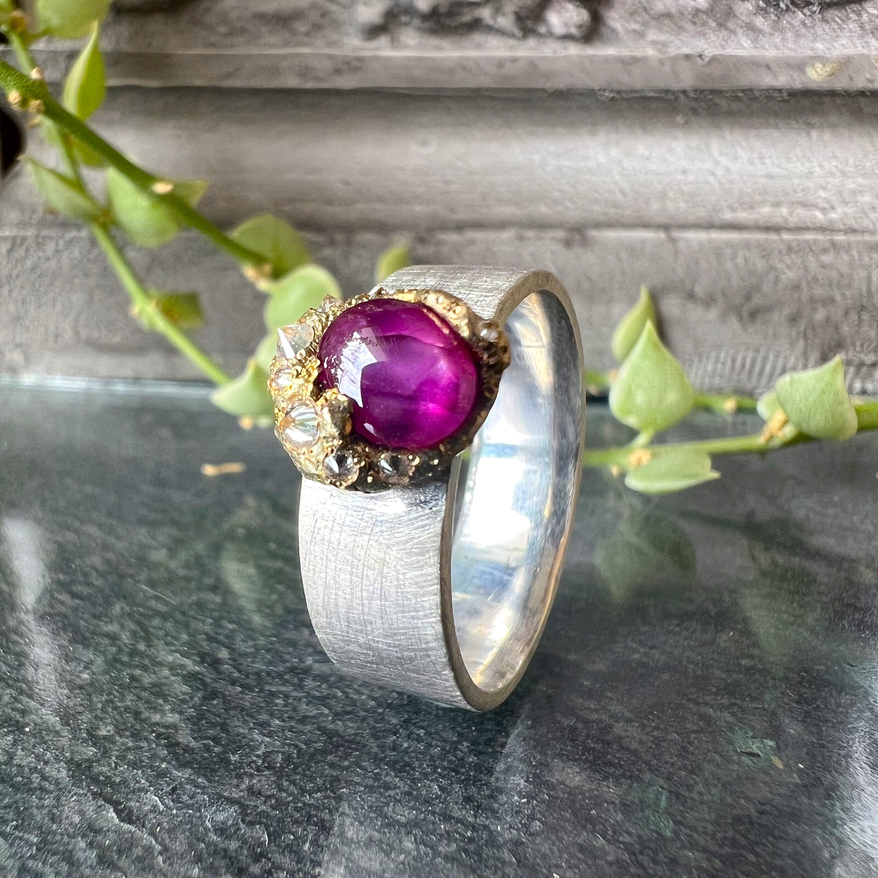 溶けた金属に直接宝石をセットする特殊な制作方法をとっており、