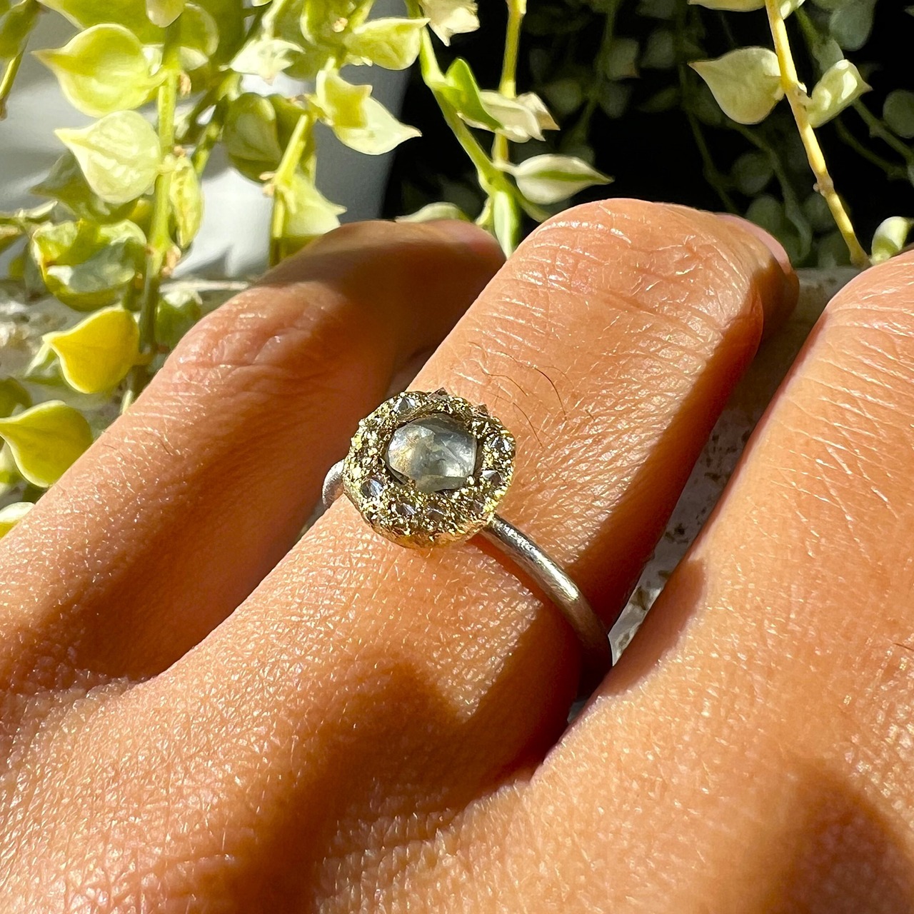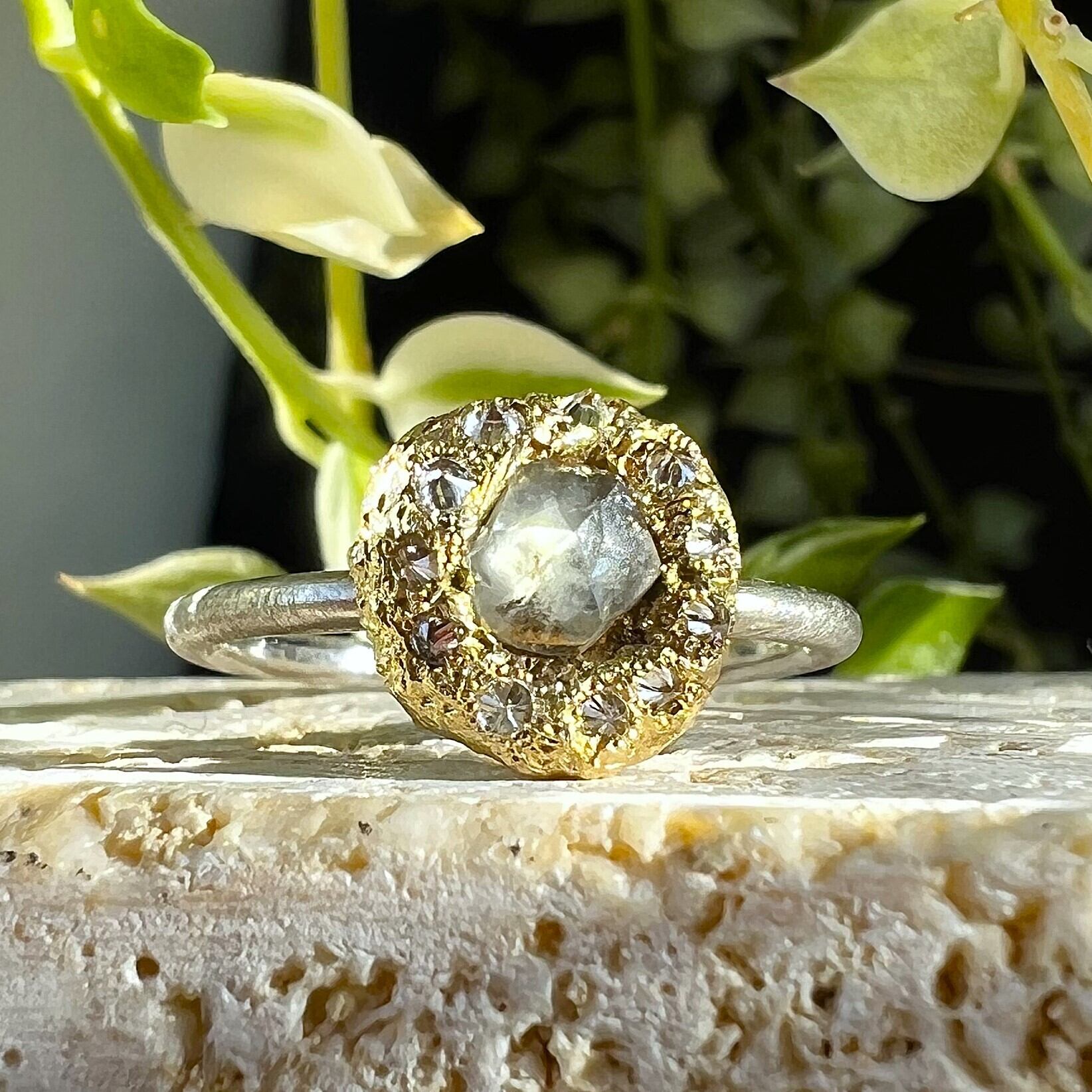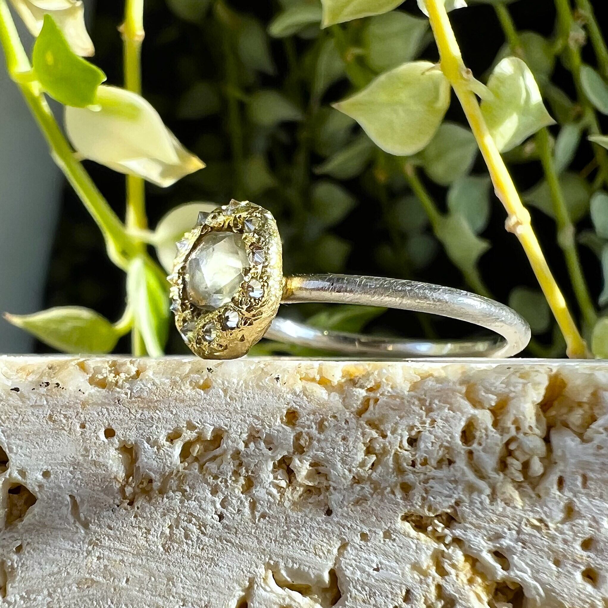 溶けた金属に直接宝石をセットする特殊な制作方法をとっており、