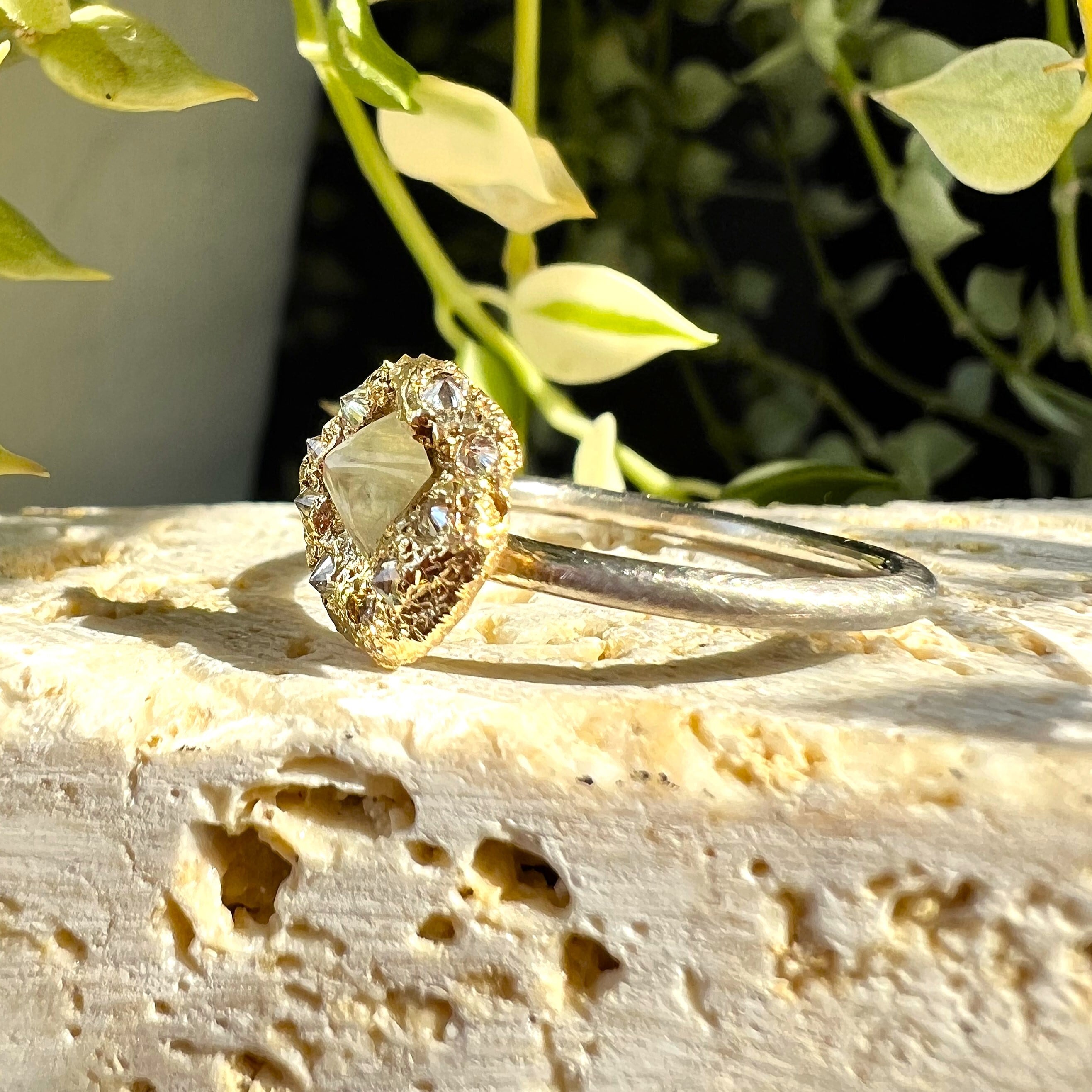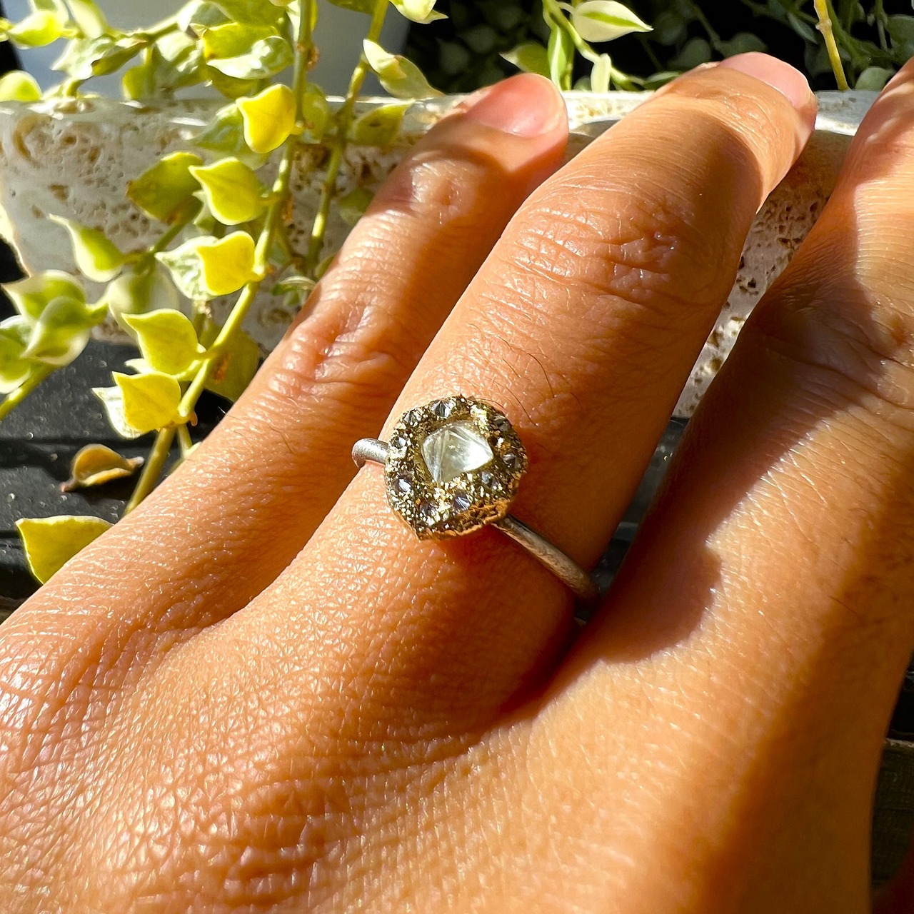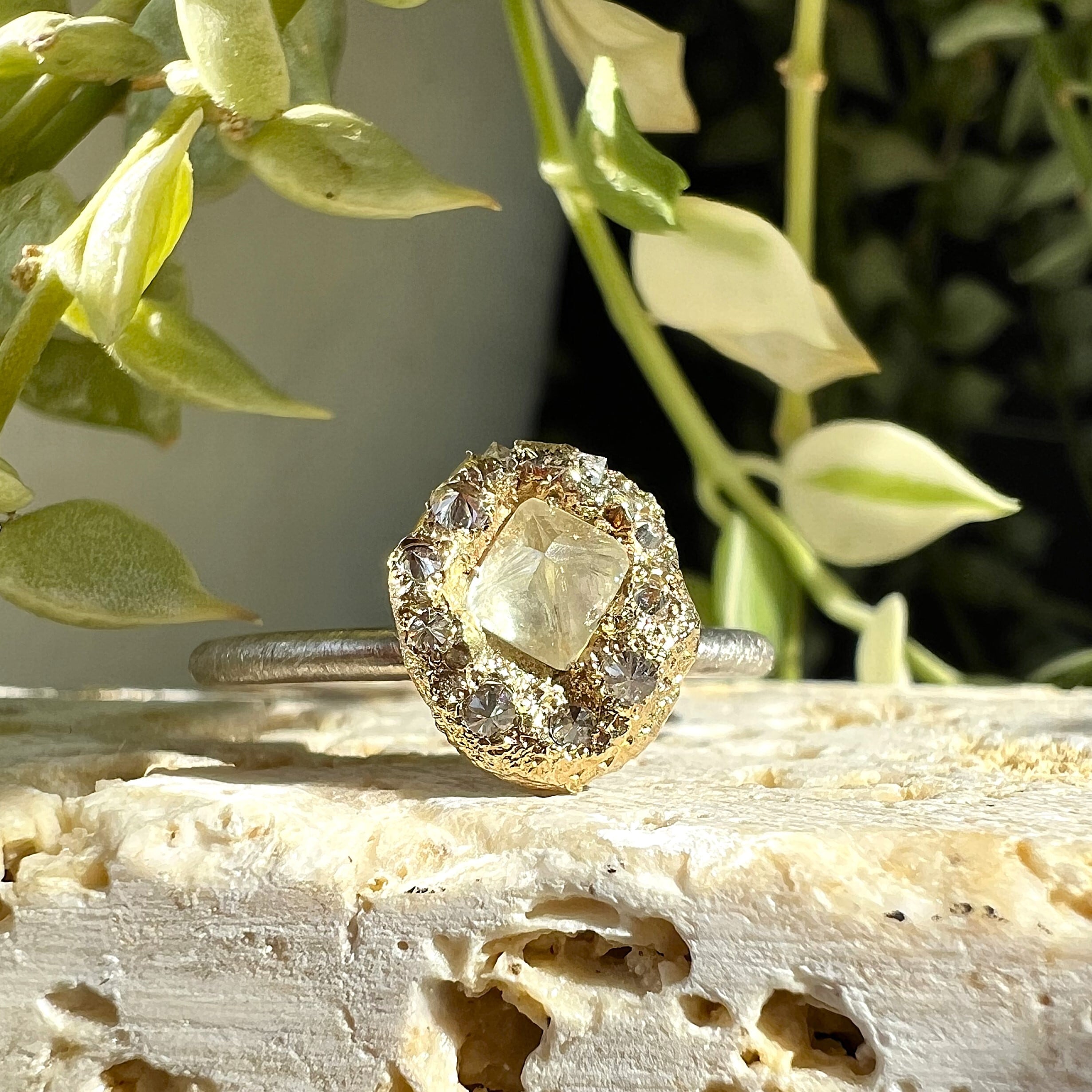 溶けた金属に直接宝石をセットする特殊な制作方法をとっており、