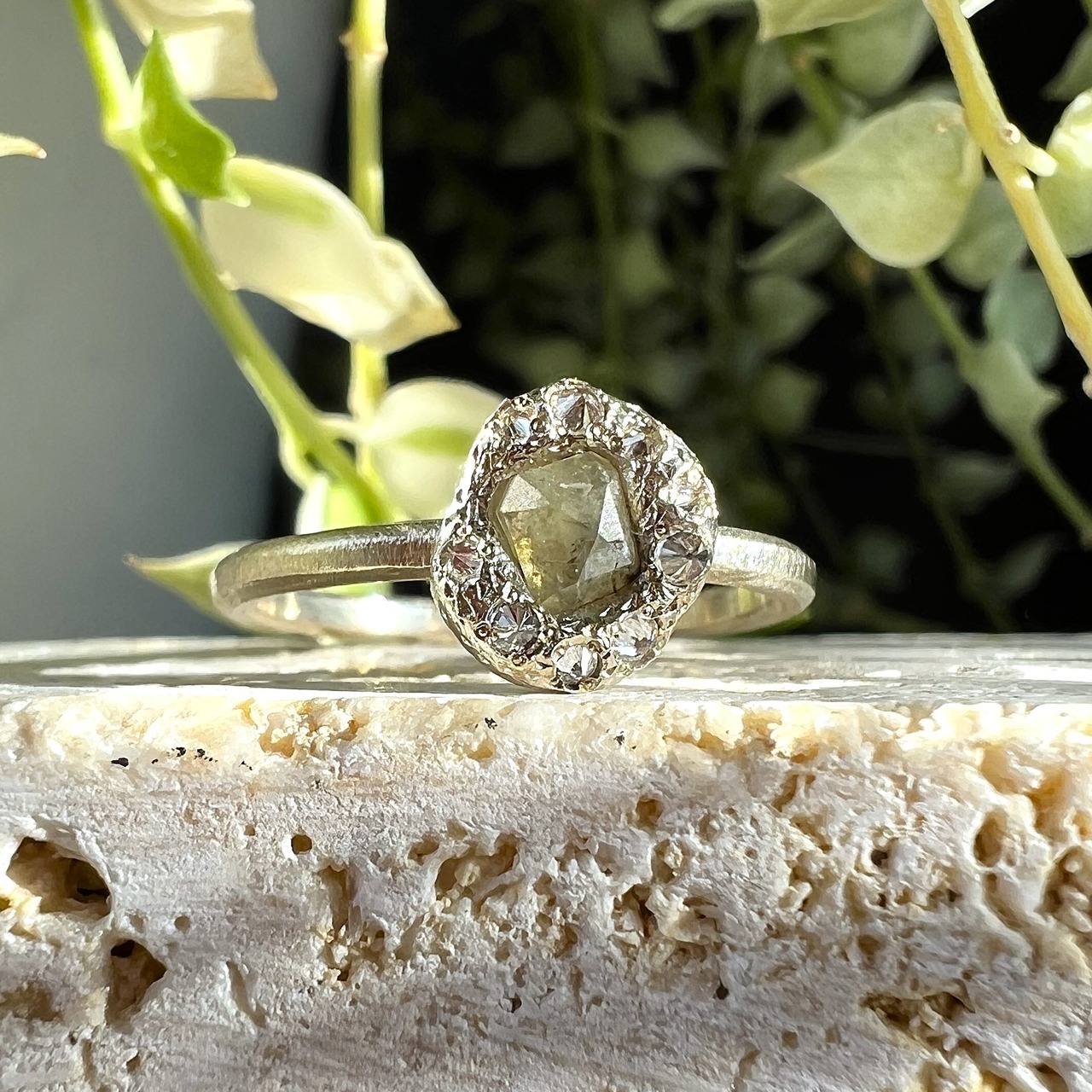 溶けた金属に直接宝石をセットする特殊な制作方法をとっており、