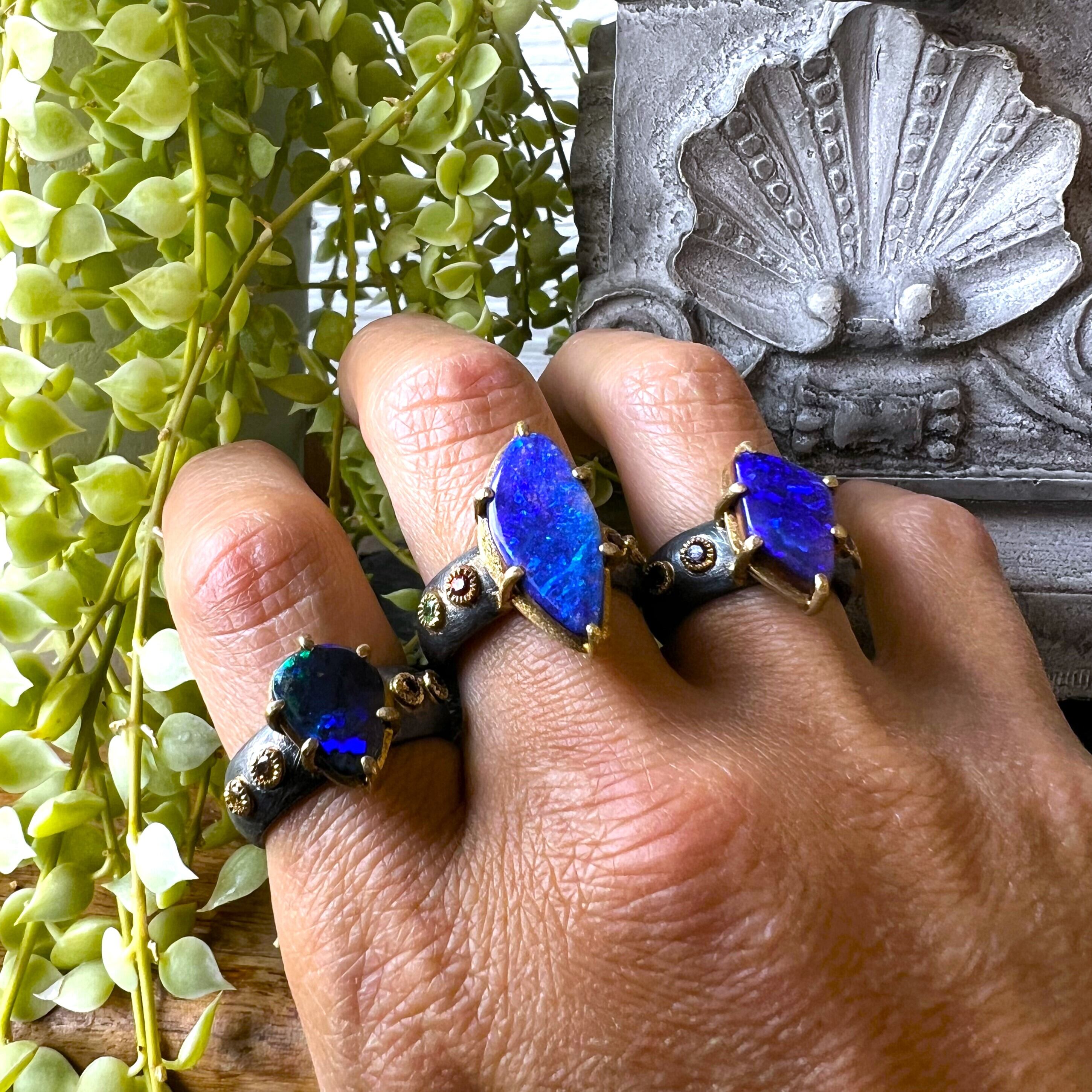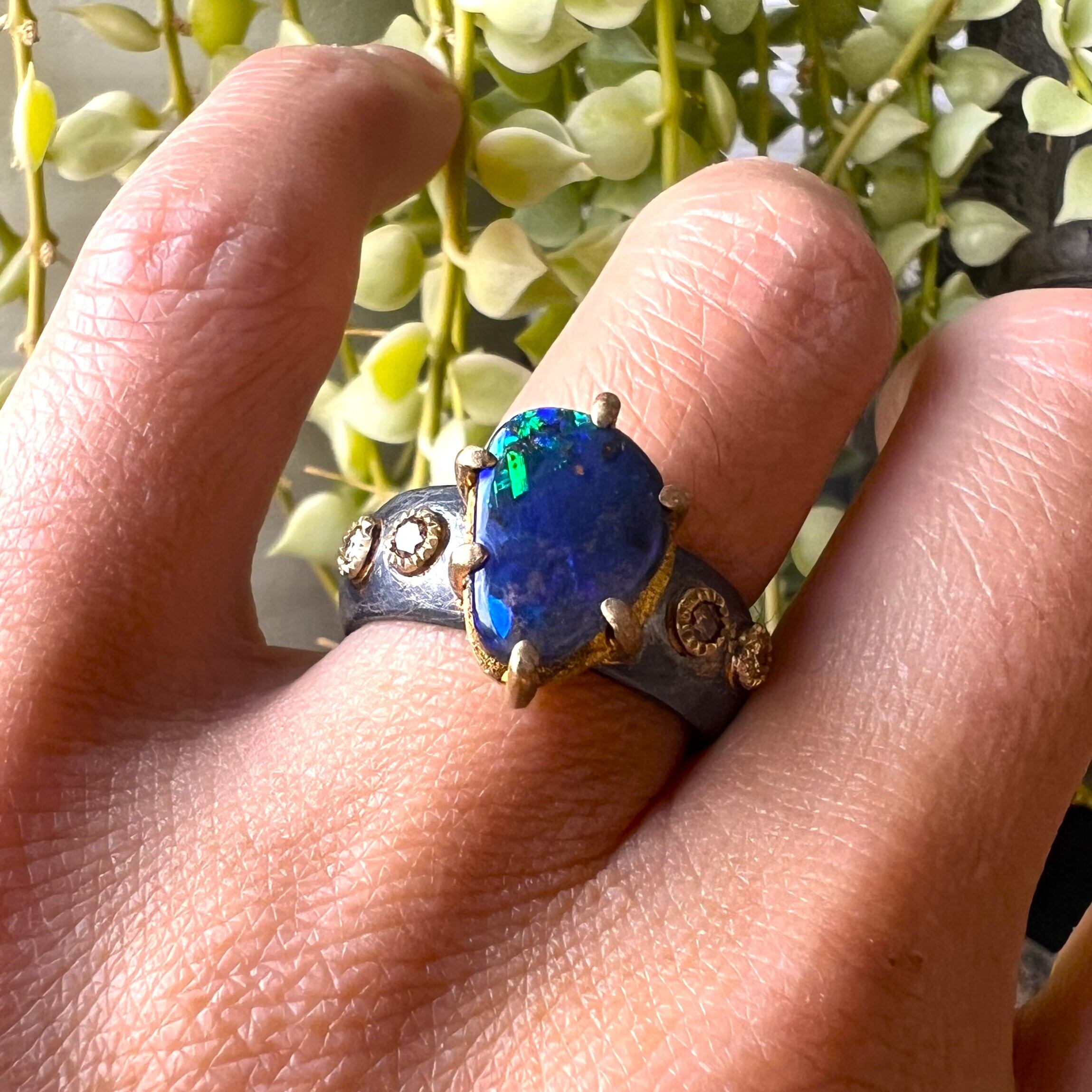 場所によりクリーンなブルーやグリーン、オレンジの遊色が楽しいオパールを使用しています。